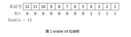 其中enable参数是unit16类型,每一个bit位代表一个从站,其中0表示DDA功能关闭,1表示DDA功能开启,如图1 所示,现需开启从站1、2、3、4号四个轴DDA功能,只需让Enable=15就可以了。
