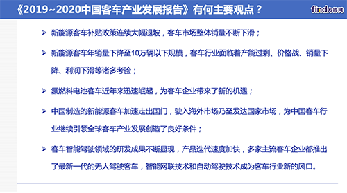 一是新能源客车补贴政策连续大幅退坡,客车市场整体销量不断下滑;二是新能源客车年销量下降至10万辆以下规模,客车行业面临着产能过剩、价格战、销量下降、利润下滑等诸多考验;三是氢燃料电池客车近年来迅速崛起,为客车企业带来了新的机遇;四是中国制造的新能源客车加速走出国门,驶入海外市场乃至发达国家市场,为中国客车行业继续引领全球客车产业发展创造了良好条件;五是客车智能驾驶领域的研发成果不断显现,产品迭代速度加快,多家主流客车企业都推出了最新一代的无人驾驶客车,智能网联技术和自动驾驶技术成为客车行业新的风口。